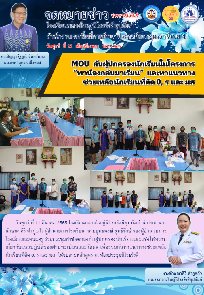 ข่าวประกาศ ข่าวประชาสัมพันธ์ MOU กับผู้ปกครองนักเรียนในโครงการ”พาน้องกลับมาเรียน” และหาแนวทางในการช่วยเหลือนักเรียนที่ติด 0 , ร และ มส 11 มีนาคม 202211 มีนาคม 2022 admin 0 Comments 2022, กลางใหญ่, ข่าวประชาสัมพันธ์โรงเรียน, นิโรธรังสีอุปถัมภ์, โรงเรียน, โรงเรียนกลางใหญ่นิโรธรังสีอุปถัมภ์